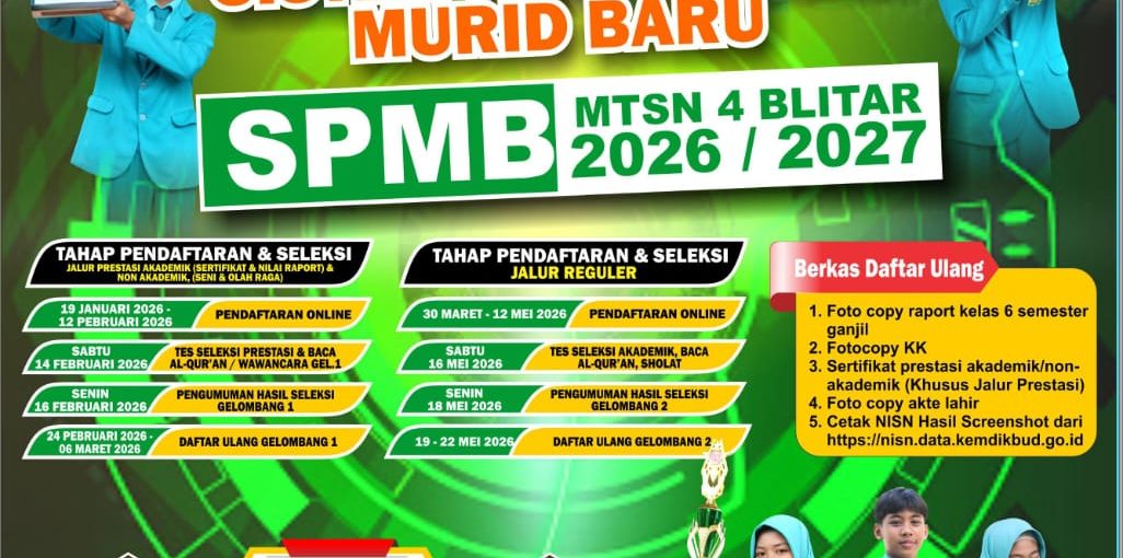 • Hai...siswa-siswi MTsN 4 Blitar, semester genap telah tiba! Yuk mulai lagi dengan hati gembira, niat yang lurus, dan semangat baru untuk belajar, berprestasi, dan saling menginspirasi.