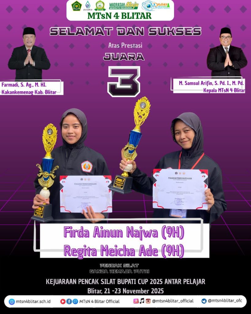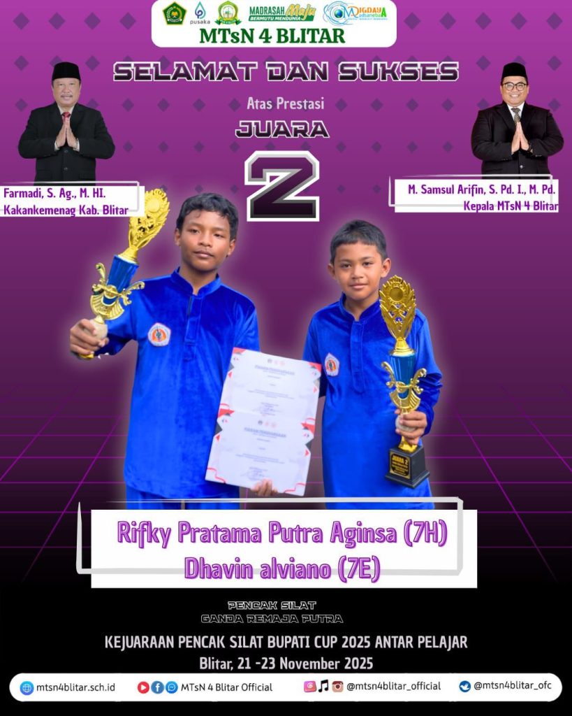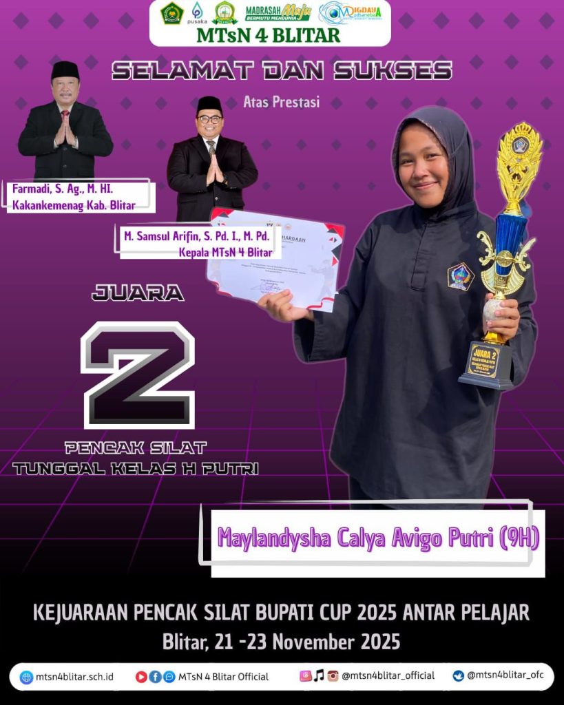 Prestasi luar biasa kembali ditorehkan oleh para atlet pencak silat MTsN 4 Blitar! Dengan penuh kebanggaan, madrasah mengumumkan capaian gemilang dalam Kejuaraan Pencak Silat Bupati Cup 2025 Antar Pelajar, yang berlangsung pada 21–23 November 2025 di Blitar.