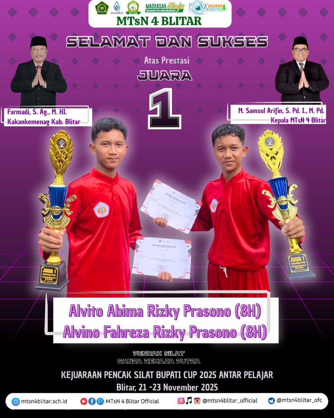 Prestasi ini bukan hanya sekadar kemenangan, tetapi juga bukti nyata bahwa ketekunan, disiplin, dan semangat juang tinggi mampu membawa hasil yang membanggakan. Para atlet telah menunjukkan jiwa sportivitas dan mental juara yang kuat, menjadikan MTsN 4 Blitar semakin diperhitungkan dalam dunia pencak silat pelajar.