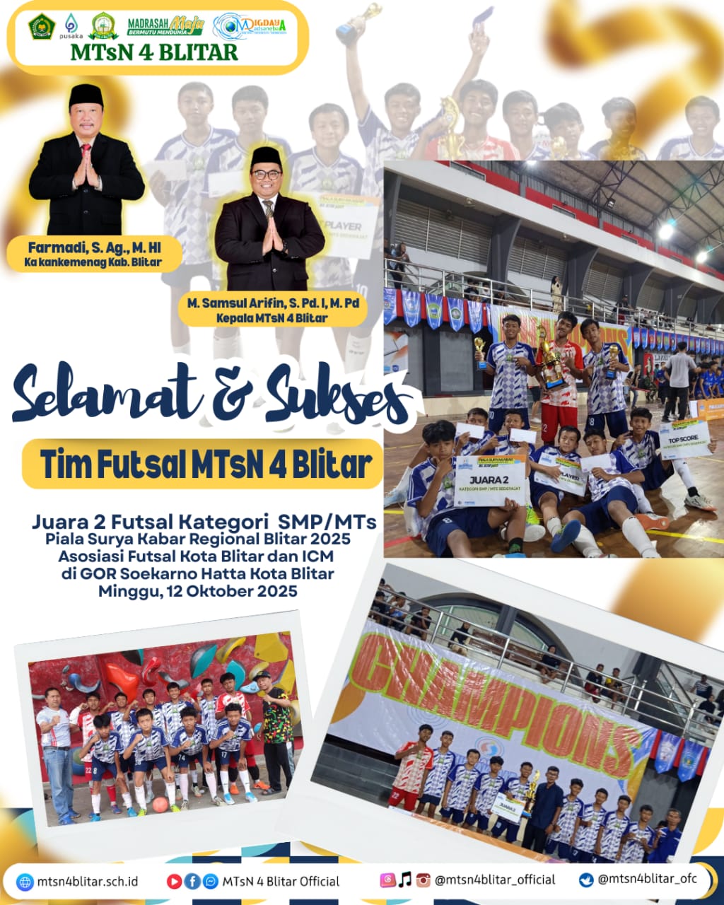 Dengan semangat pantang menyerah, MTsN 4 Blitar terus membuktikan diri sebagai madrasah yang tidak hanya berprestasi dalam bidang akademik, tetapi juga unggul dalam olahraga, karakter, dan semangat juang. Terus berlatih, terus berjuang, anak-anak hebat! Piala berikutnya sudah menunggu!