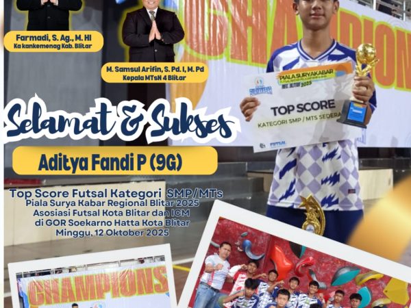 Dua pemain terbaik dari MTsN 4 Blitar berhasil mengharumkan nama madrasah di panggung futsal regional. M. Danu Nastangin (9G) dinobatkan sebagai Best Player berkat kepemimpinan dan permainan impresifnya yang mampu menghidupkan ritme tim di setiap laga. Sementara itu, Aditya Fandi P (9G) sukses menyabet gelar Top Score, berkat ketajamannya dalam mencetak gol dan insting tajamnya di depan gawang lawan.