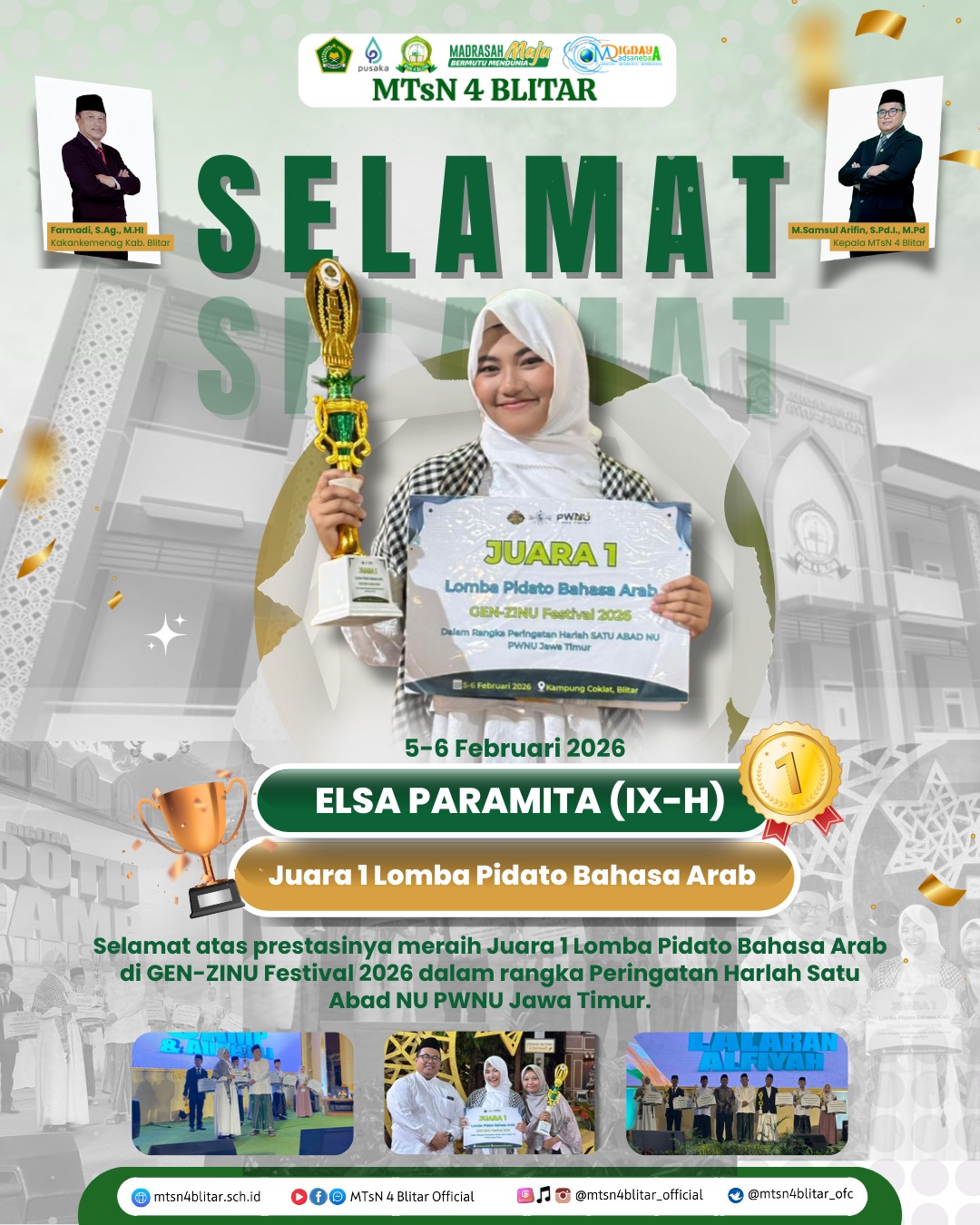 Alhamdulillahirabbil ‘alamin, kabar membanggakan kembali datang dari keluarga besar MTsN 4 Blitar. Salah satu putri terbaik madrasah, Elsa Paramita (IX-H), berhasil menorehkan prestasi gemilang dengan meraih 🥇 Juara 1 Lomba Pidato Bahasa Arab pada ajang GEN-ZINU Festival 2026.